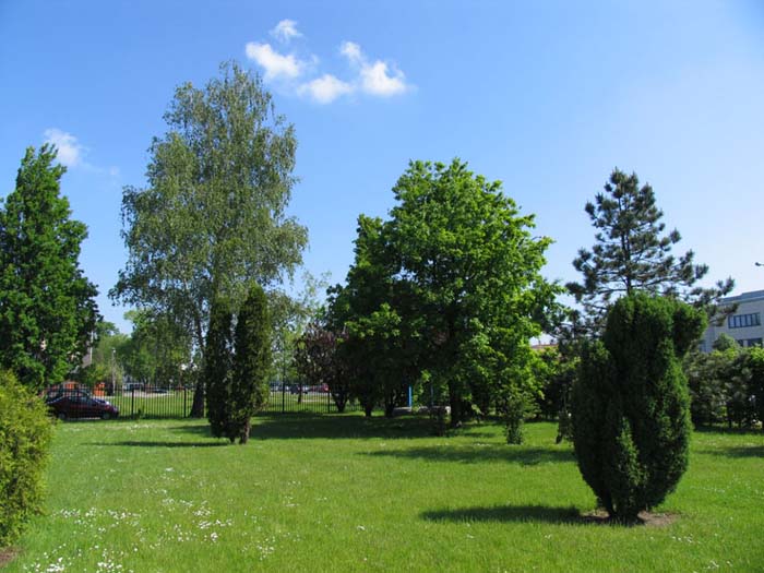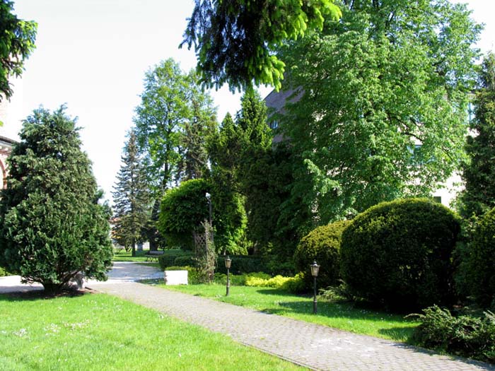 Część ogrodu z widokiem na kościół od strony plebanii.